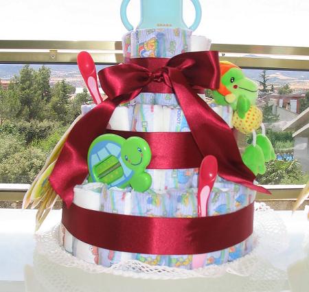 Puedes encargarlas en alguna tienda, o si eres mañosa, probar a hacer tú misma las tartas de pañales, como esta que ves en portada y que encontré en el blog El placer de los sentidos.